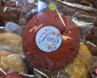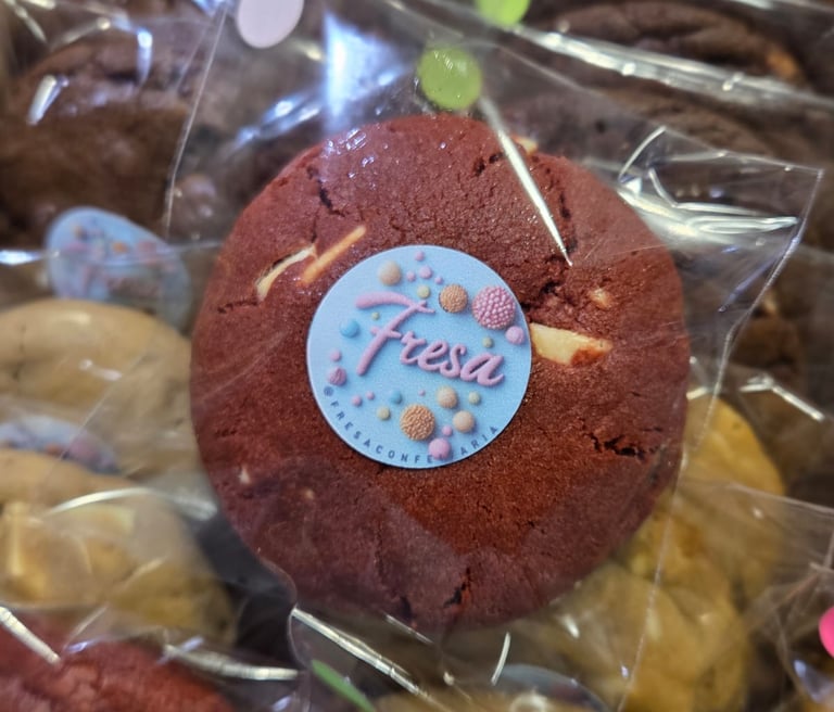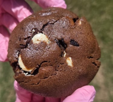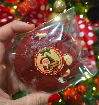 Cookies de baunilha com gotas de chocolate ao leite, chocolate branco e meio amargo recheado com creme de avelã e leite.
